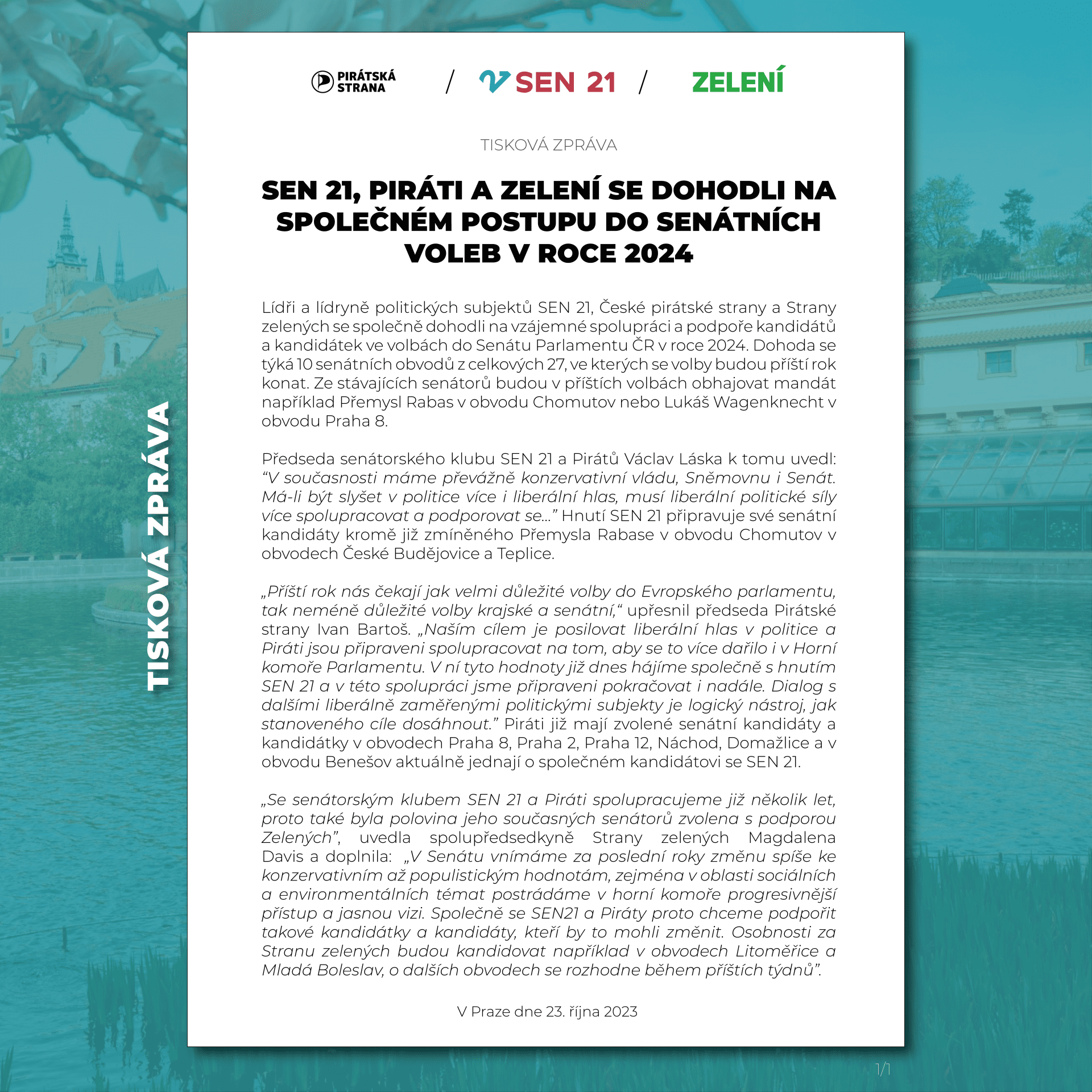 „V Senátu vnímáme za poslední roky změnu spíše ke konzervativním až populistickým hodnotám, zejména v oblasti sociálních a environmentálních témat postrádáme v horní komoře progresivnější přístup a jasnou vizi. Společně se SEN21 a Piráty proto chceme podpořit takové kandidátky a kandidáty, kteří by to mohli změnit. Osobnosti za Stranu zelených budou kandidovat například v obvodech Litoměřice a Mladá Boleslav, o dalších obvodech se rozhodne během příštích týdnů”.